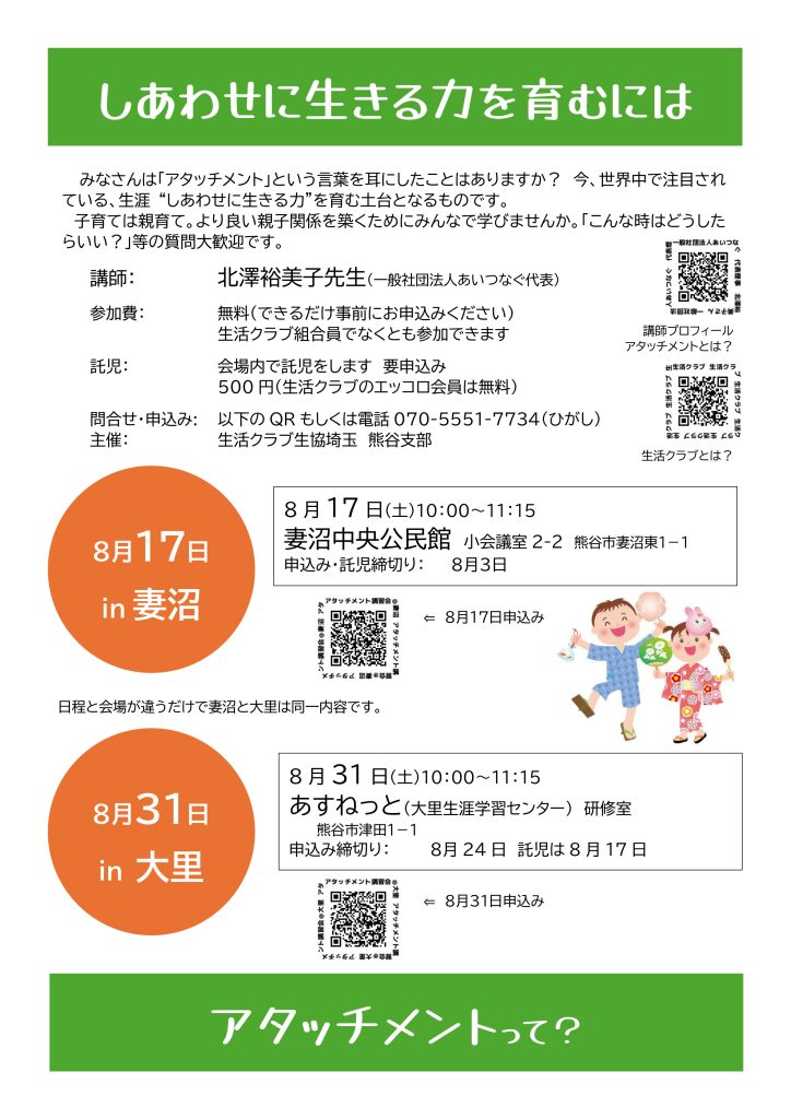 講演会のお知らせです♪ 投稿者: あいつなぐ2024年7月17日2024年12月22日お知らせ みなさま、お久しぶりです。代表・北澤の講演会のお知らせです。親子間の健全な愛着関係=アタッチメントの重要性を考える講演となります。アタッチメントは、当法人の現在の活動テーマであり、昨今の多くの社会的問題に根底にある問題であると、わたしたちはみなしています。現在子育てに取り組まれている親御さんはもちろん、教育・療育方面に関心をお持ちのみなさまは、ぜひ参加をご検討してみてください。