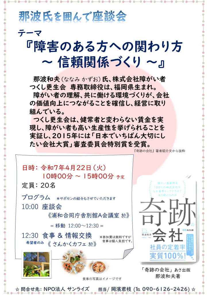 那波さんの座談会のお知らせです 投稿者: あいつなぐ2025年3月16日2025年3月16日お知らせ お知らせです。先に刊行された『奇跡の会社』の著者で、福岡県の株式会社つくし更生会の専務取締役である那波和夫さんを囲んでの座談会が、この度さいたま市で開催されることになりました。日時・連絡先は以下の通りです。 日時:4月22日(火)10:00~15:00場所: 浦和合同庁舎別館A会議室(10:00~12:00) さんかくカフェ(12:30~15:00)定員:20名連絡先:090ー6126ー2426(NPO法人サンライズ:担当 岡濱)